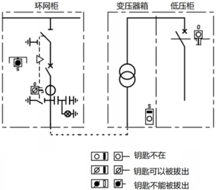 如圖7所示,環(huán)網(wǎng)柜內(nèi)部,阻隔/接地開關(guān)與電纜室門之間的鑰匙聯(lián)鎖,電纜室蓋板翻開后,鑰匙被鎖定,不能拔出插入到阻隔開關(guān)鎖,即不能操作接地開關(guān);只要蓋板合上,鑰匙才干拔出,去操作接地開關(guān)分閘。而體系角度,只要接地開關(guān)合閘,鑰匙才干被取出,去開變壓器箱的門,完結(jié)變壓器檢修,一起低壓斷路器不能合閘。