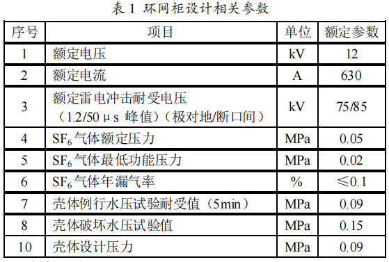 環網柜殼體形狀不同有箱式和筒式之分。由于箱式結構有利于實現進出線.配電方案的實施,但是箱式在承受壓力的局限性,使箱體不能夠承受太高的壓力。下面介紹一種環網柜氣箱的設計方法。與氣箱設計有關的環網柜額定參數見表1