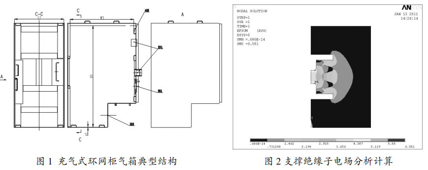 高壓帶電體對地最小間隙處在支撐絕緣子上,通過計算支撐絕緣子的電場如圖2,滿足電場要求,最終確定對地最小間隙。依據最小間隙準則確定氣箱外形尺寸(L1xW1xH1)