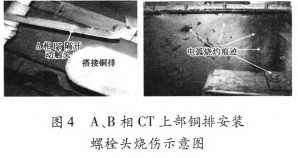 斷路器氣室內部PT阻隔開關A相動觸頭變形,未搭在觸摸銅排上,端頭有明顯炙烤痕跡;B相動觸頭端頭有燒傷痕跡;ACT旁氣室壁有明顯燒傷痕跡;A相和BCT上部銅排設備螺栓頭燒傷,斷路器室頂部方位有電弧燒傷痕跡,如圖4所示。
