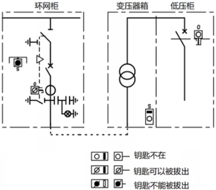 如圖7所示,環網箱內部,阻隔/接地開關與電纜室門之間的鑰匙聯鎖,電纜室蓋板翻開后,鑰匙被肯定,不能拔出刺進到阻隔開關鎖,即不能操作接地開關;只需蓋板合上,鑰匙才氣拔出,去操作接地開關分閘。而體系視點,只需接地開關合閘,鑰匙才氣被取出,去開變壓器箱的門,完畢變壓器檢修,一同低壓斷路器不能合閘。