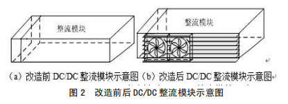 (1)在裝置功率元件一側加裝散熱片,并于散熱片上面裝設常規風扇,從而擴大散熱面積,增強空氣流通,起到散熱降溫作用,如圖3所示改進前后示意圖。